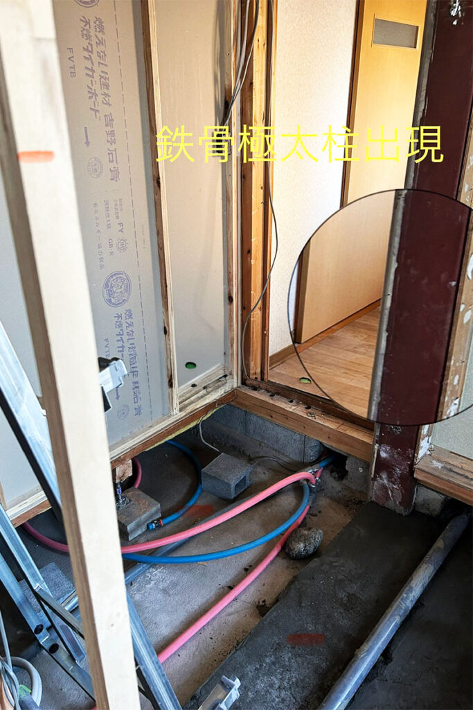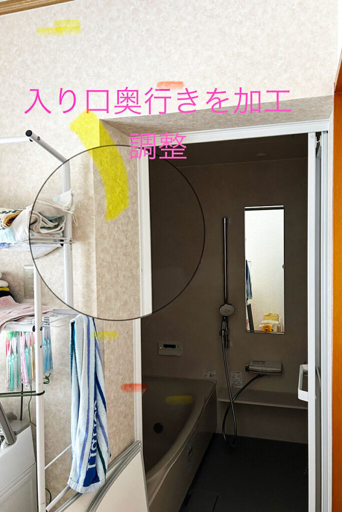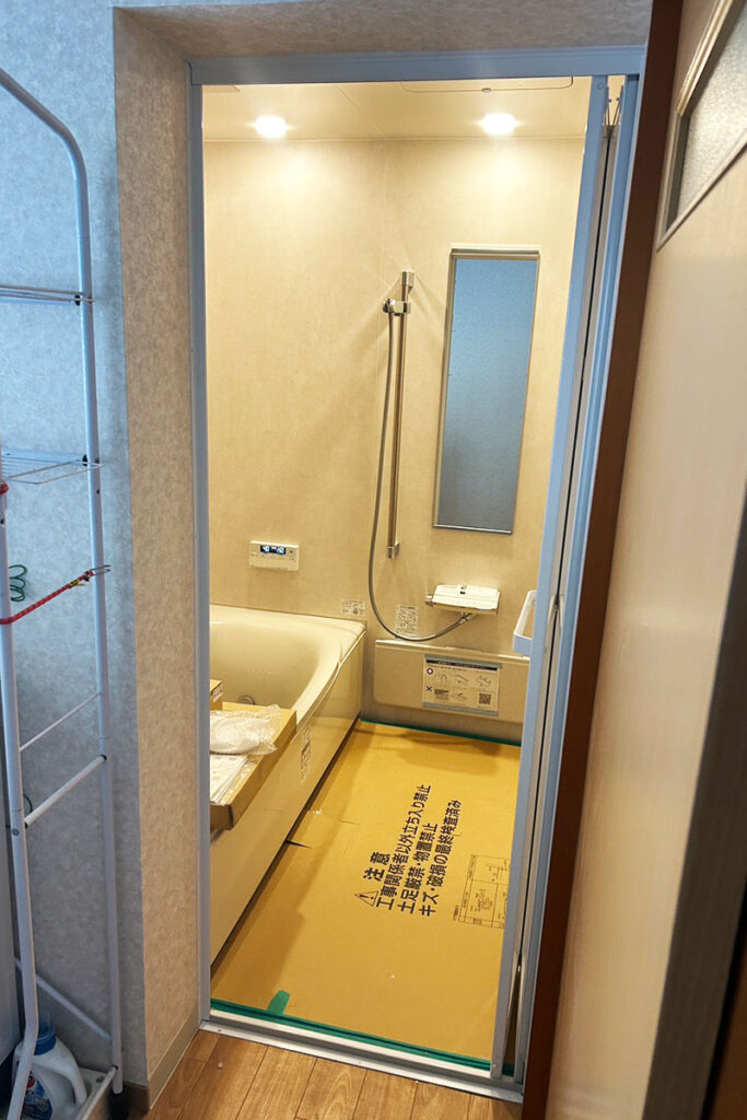 将来を見据え、和室の一部を浴室へ変更。工事中、想定外の極太な鉄骨柱が現れましたが、入口の奥行をミリ単位で加工調整することで、広々としたバリアフリーな空間を実現しました。
